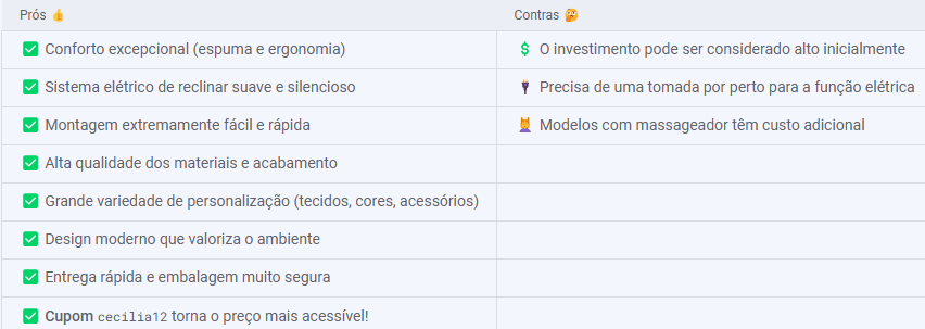 Seja para montar seu cinema particular, ter um cantinho perfeito para leitura, relaxar depois do trabalho ou até mesmo para momentos especiais como a amamentação, ela entrega tudo com excelência. A durabilidade dos materiais e a atenção aos detalhes mostram que é um produto feito para durar.